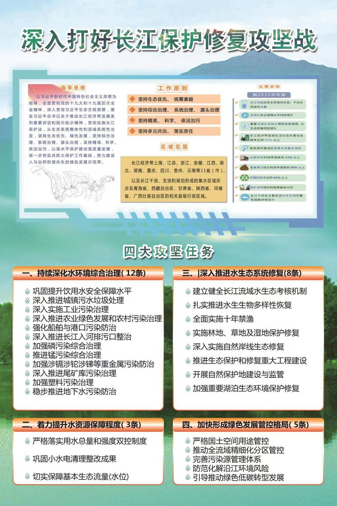 《方案》提出,到2025年底,长江流域饮用水安全保障水平持续提升,重要河湖生态用水得到有效保障,水生态质量明显提升;长江经济带县城生活垃圾无害化处理率达到97%以上,县级城市建成区黑臭水体基本消除,化肥农药利用率达到43%,畜禽粪污综合利用率达到80%以上,农膜回收率达到85%以上,尾矿库环境风险隐患基本可控;长江干流及主要支流水生生物完整性指数持续提升。