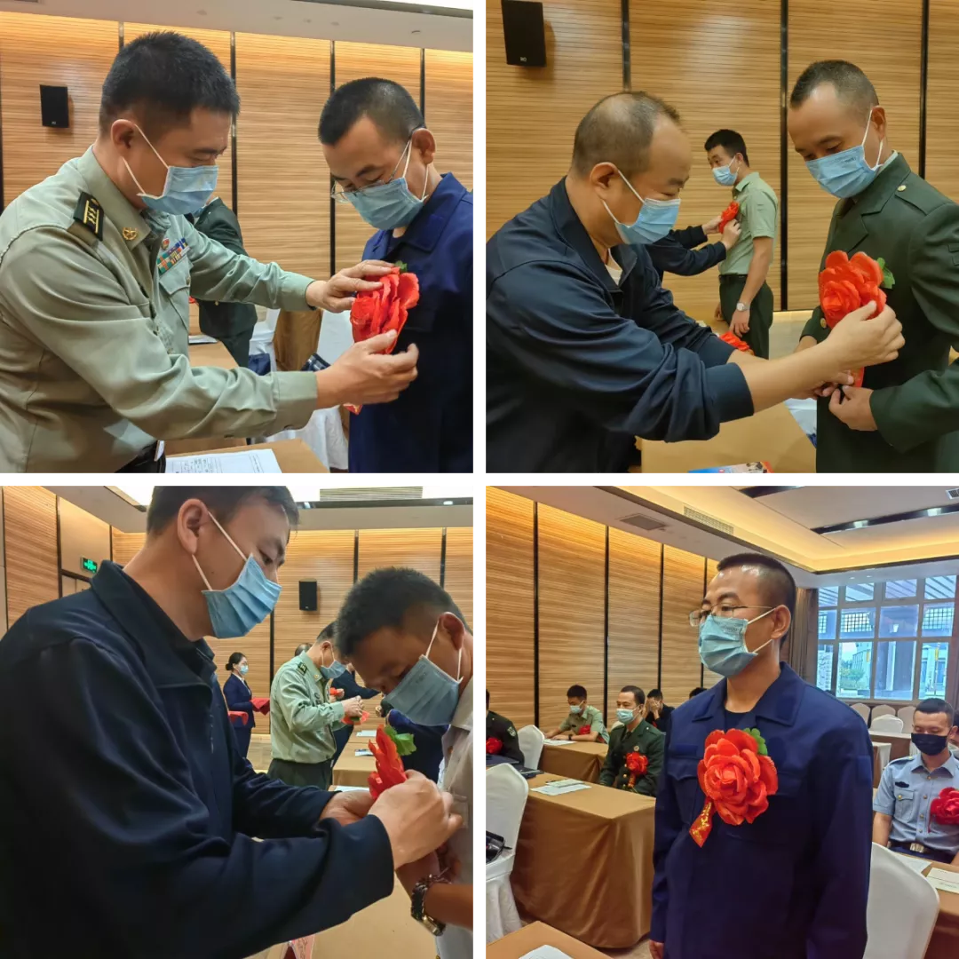 会上,为退役士兵佩戴了大红花,全体人员奏唱《中华人民共和国国歌》,退役士兵逐个汇报了个人简历并进行宣誓。