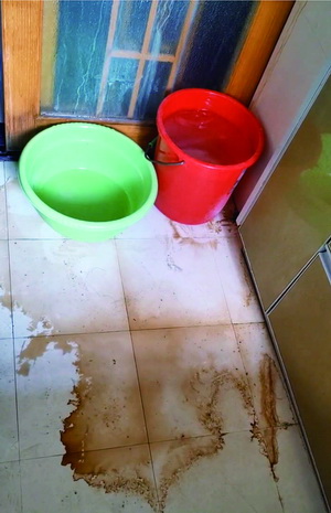 曾女士向记者展示照片和视频,视频为8月21日保洁人员拍摄。视频显示,厨房地面有积水,天花板有浑浊泛黄的水不断下落,只能用桶盆接水,没一会儿就接了满满一桶。曾女士说:“厨房的实木门已经被水浸得发黑,整扇门全是水。次卧、餐厅的墙面上也有几米布满漏水后的漆黑污渍。漏水问题对我的房子造成了不小的损失。”