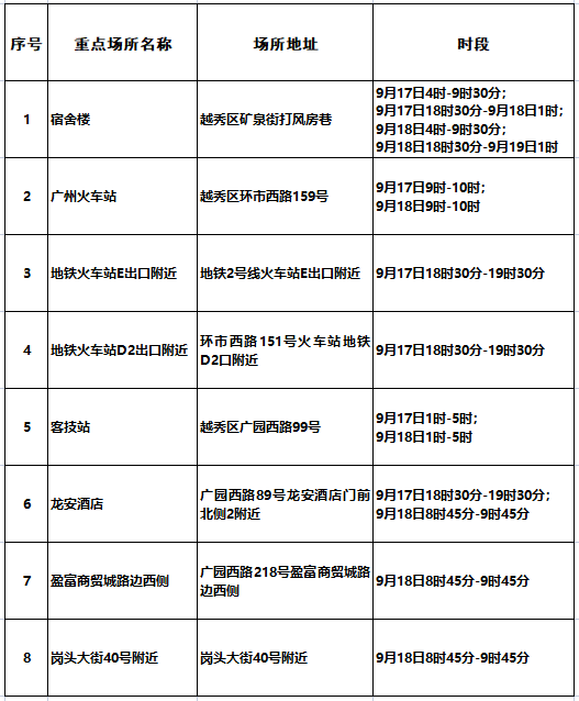 9月18日,广州火车站在重点人群例行核酸筛查中发现1名阳性人员。区新冠肺炎疫情防控指挥部立即启动应急响应,实施区域管控、流调溯源、隔离转运、核酸筛查、场所消杀等工作。现将有关情况通报如下: