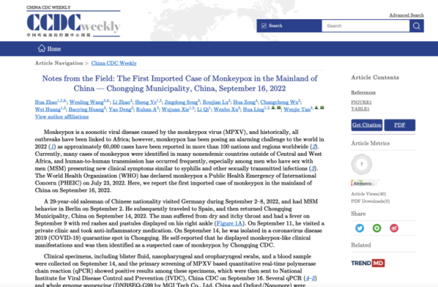 据中国青年报消息,中国疾控中心周报今天发布了《现场纪要:中国内地首例输入性猴痘病例——中国重庆市,2022年9月16日》(以下简称“现场纪要”)。