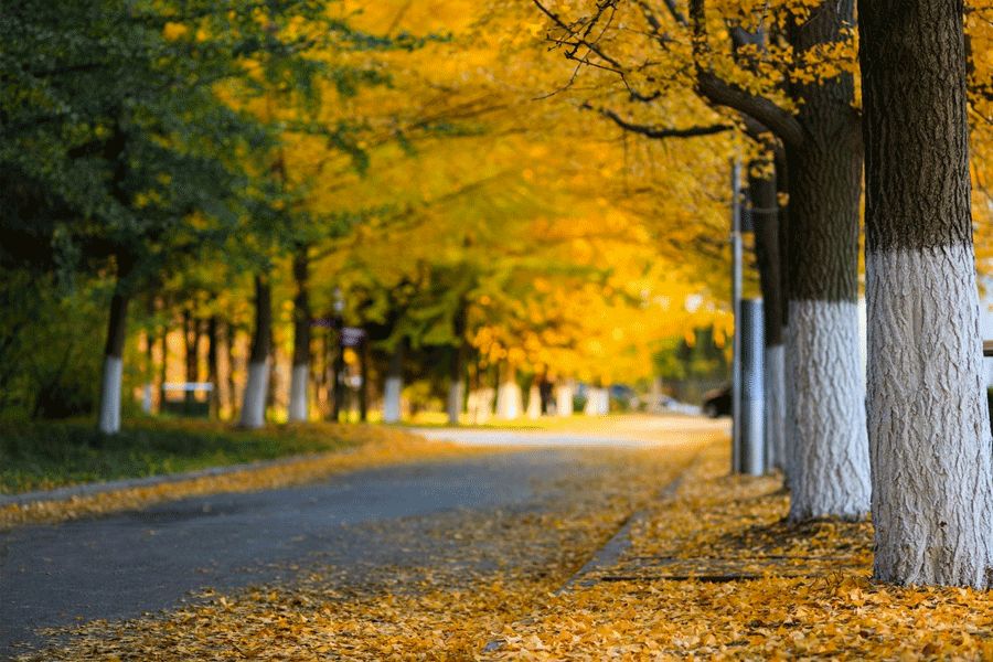 天空澄澈高远,绘画馆前夹道成排的银杏树,比历年更显鲜艳明丽,闪耀着金色的光泽。