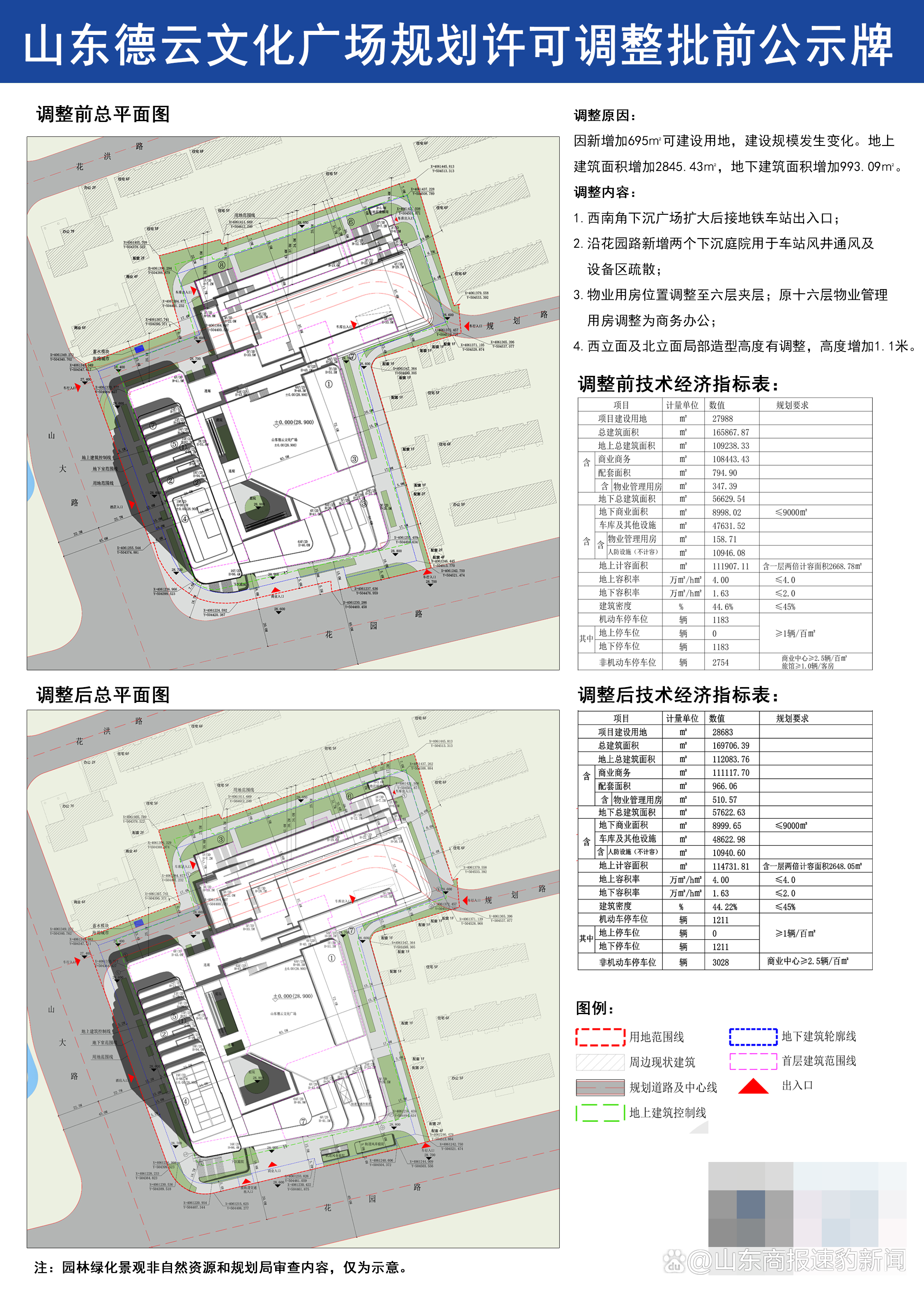 根据公示,此次规划调整原因为新增加695㎡可建设用地,建设规模发生变化。地上建筑面积增加2845.43㎡,地下建筑面积增加993.09㎡。因此,此次调整共涉及四项,原来位于山大路和花园路交叉口的西南角小型下沉广场扩大后接地铁车站出入口;沿花园路新增两个下沉庭院用于车站风井通风及设备区疏散;物业用房位置调整至六层夹层,原十六层物业管理用房调整为商务办公;西立面及北立面局部造型高度有调整,高度增加1.1米。