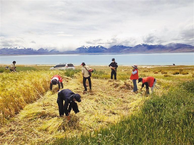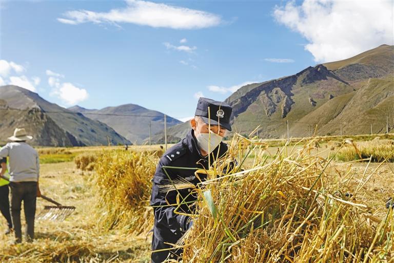 近日,日喀则市康马县公安局在统筹安排好工作的同时,组织民辅警志愿者深入南尼乡楚嘎村田间地头,帮助缺劳力家庭开展秋收。在丰收的田野上,民辅警志愿者分工明确,有的用背负式收割机收割,留下一排排青稞茬;有的将成熟的青稞捆扎,堆积成一排排青稞垛子,进行晾晒;有的忙于收集青稞穗,不浪费一粒粮食。