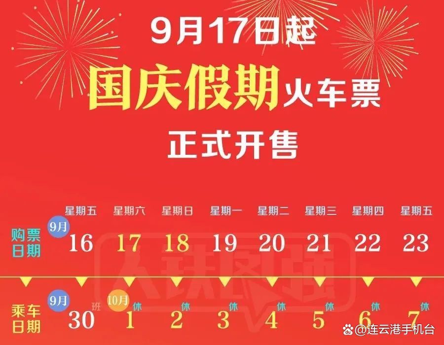 2022年国庆节放假时间为10月1日至7日。按照铁路客票预售期15天的规定,9月17日起,旅客可以通过12306网站、APP等购买国庆黄金周首日(10月1日)火车票,而10月6日和7日火车票将分别于9月22和23日开售。