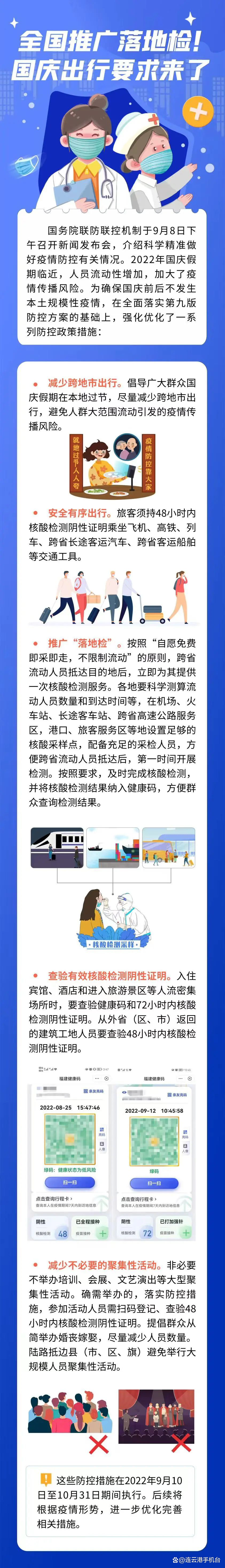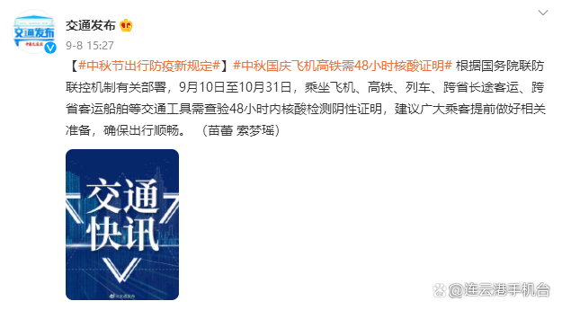 根据国务院联防联控机制有关部署,9月10日至10月31日,乘坐飞机、高铁、列车、跨省长途客运、跨省客运船舶等交通工具需查验48小时内核酸检测阴性证明,建议广大乘客提前做好相关准备,确保出行顺畅。
