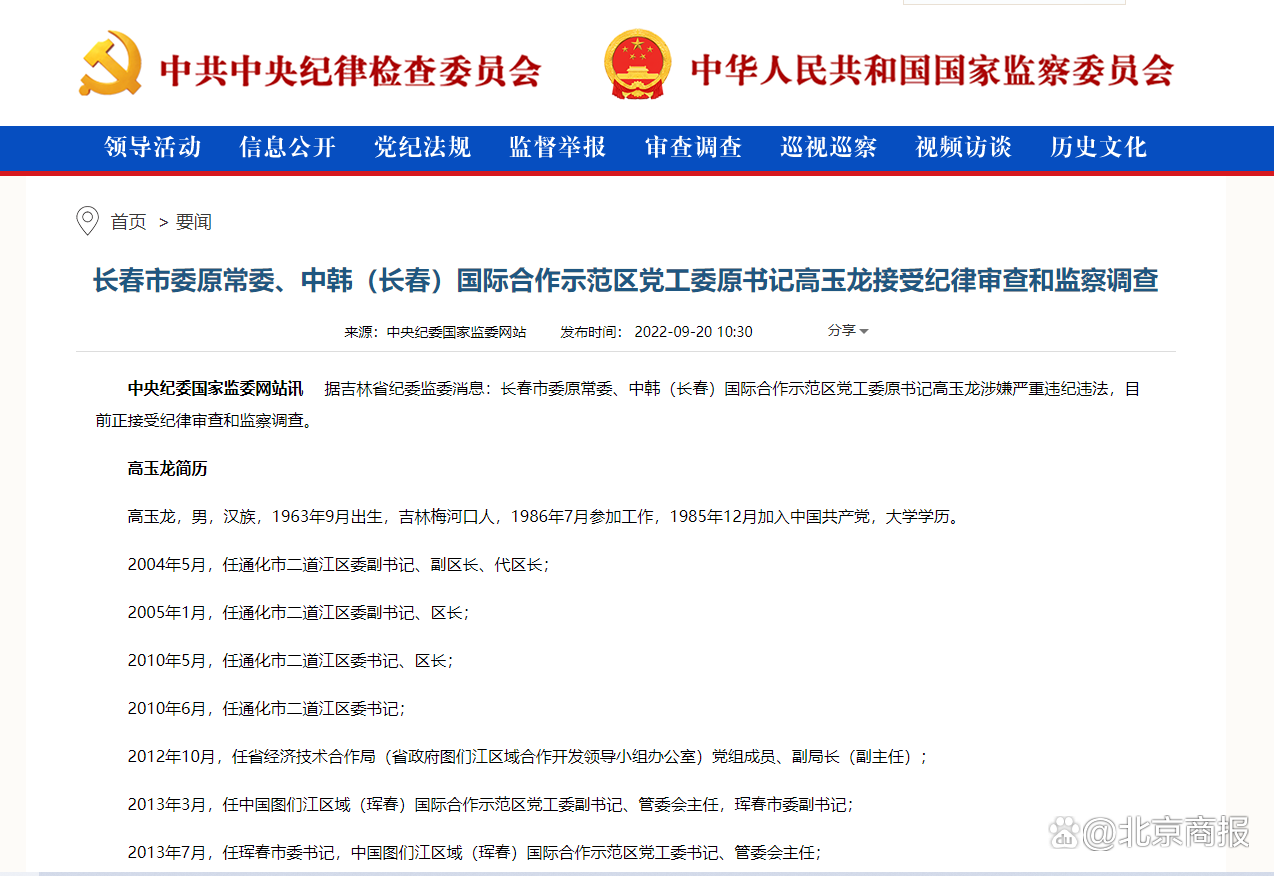 中央纪委国家监委网站讯 据吉林省纪委监委消息:长春市委原常委、中韩(长春)国际合作示范区党工委原书记高玉龙涉嫌严重违纪违法,目前正接受纪律审查和监察调查。