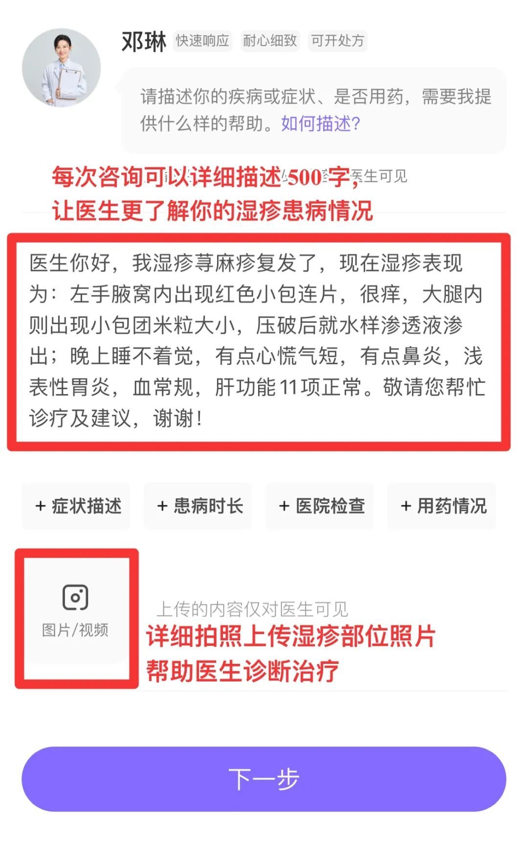拍照上传、描述近期症状变化、持续时长和希望得到的帮助,简单几步就能咨询全国三甲医院的专业皮肤科医生。