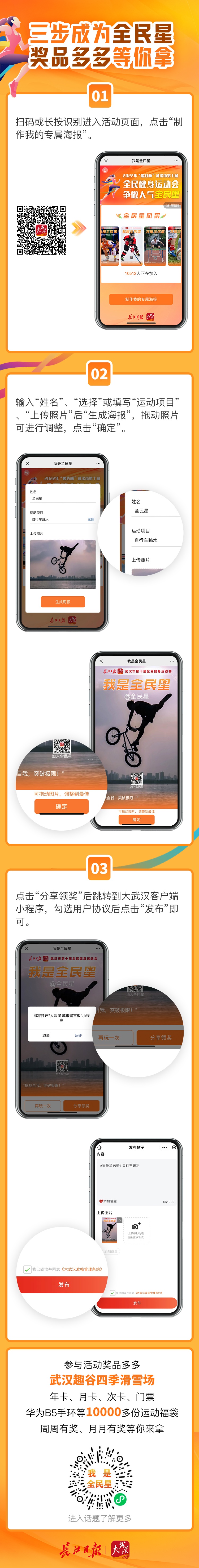 长江日报大武汉客户端“我是全民星”全媒体互动活动将持续至12月1日。2022年“趣谷杯”武汉市第十届全民健身运动会的选手们也将参与“我是全民星”全媒体互动活动,在大武汉客户端#我是全民星#话题区,市民可以为自己喜欢的选手点赞,将他们的运动风采分享给更多人。人气指数(即被点赞量、被转发量总和)前5名的选手将获得“全民星”超人气奖,他们将在武汉市第十届全民健身运动会颁奖仪式上亮相并获得证书奖励。所有参与活动的用户也可获得多重奖励,其中获得“全民星”风采一等奖的用户,还能和选手们同台亮相获得证书奖励。
