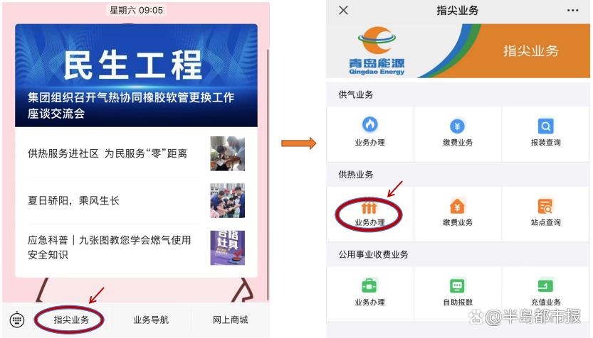 二、进入“青岛能源集团”公众号,点击左下角“指尖业务”,选择“供热业务”中“业务办理”
