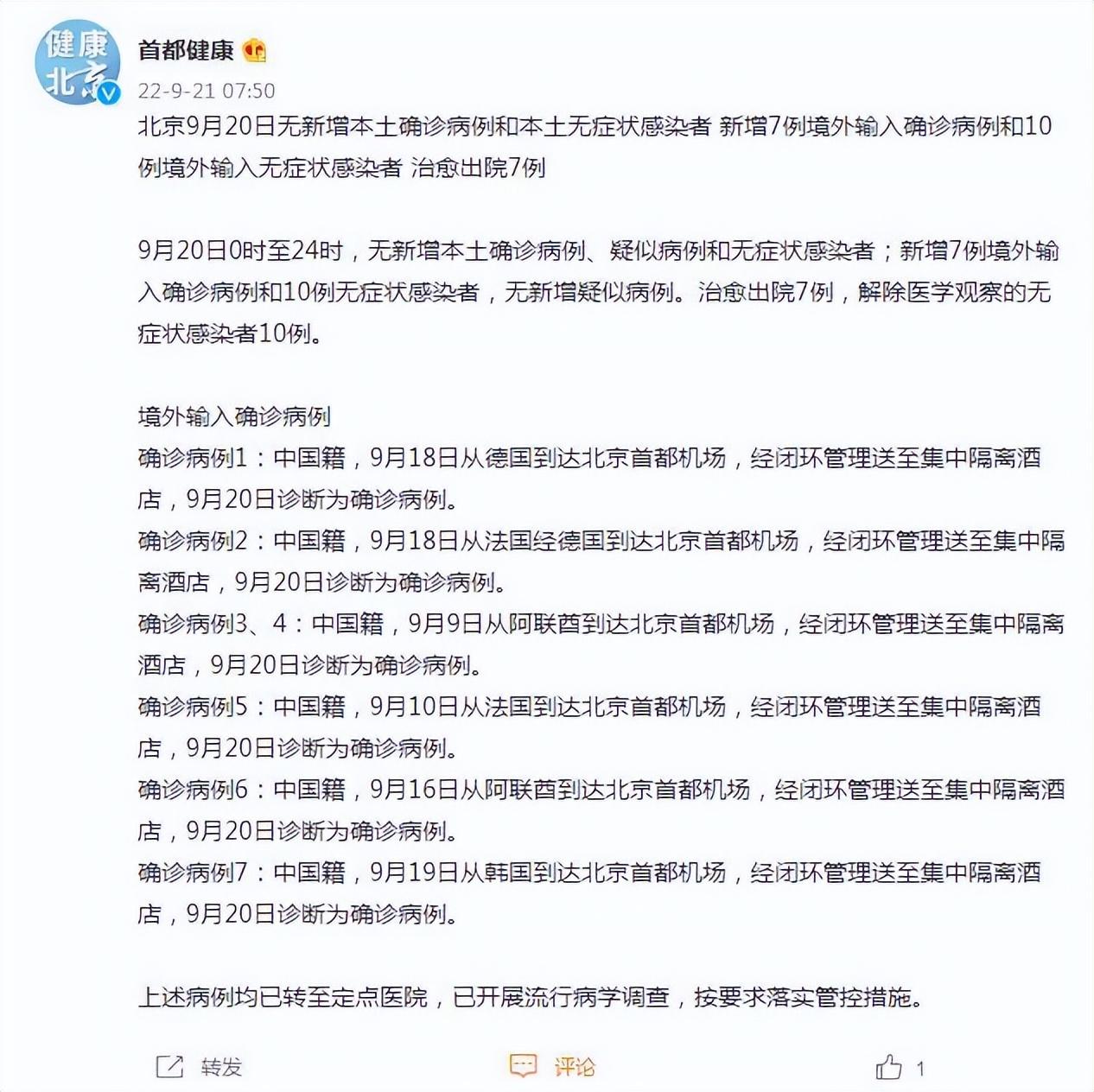 北京9月20日无新增本土确诊病例和本土无症状感染者 新增7例境外输入确诊病例和10例境外输入无症状感染者 治愈出院7例