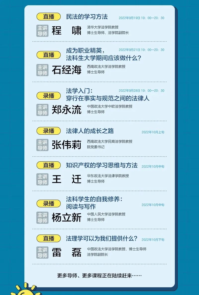 2022年9月-10月,全国高校“法科生成长计划”公益系列直播课将进行第一季首批七场课程播放,授课采取线上直播或录播形式。后续主办方将以每月1-2场的频次安排课程直播。