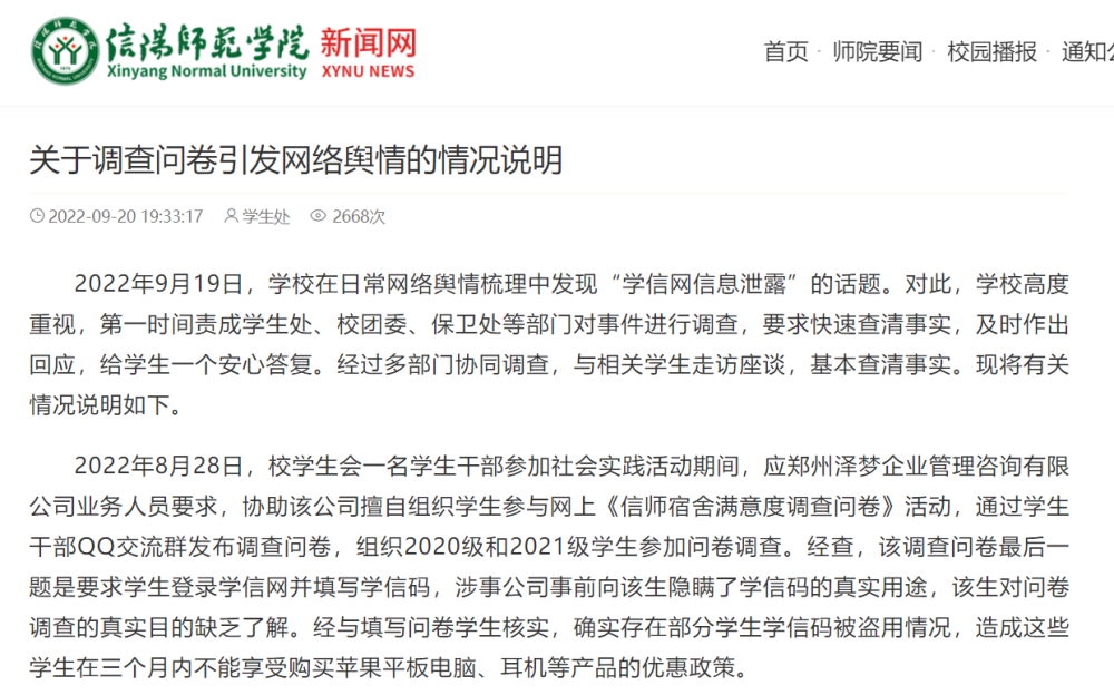 2022年8月28日,校学生会一名学生干部参加社会实践活动期间,应郑州泽梦企业管理咨询有限公司业务人员要求,协助该公司擅自组织学生参与网上《信师宿舍满意度调查问卷》活动,通过学生干部QQ交流群发布调查问卷,组织2020级和2021级学生参加问卷调查。经查,该调查问卷最后一题是要求学生登录学信网并填写学信码,涉事公司事前向该生隐瞒了学信码的真实用途,该生对问卷调查的真实目的缺乏了解。经与填写问卷学生核实,确实存在部分学生学信码被盗用情况,造成这些学生在三个月内不能享受购买苹果平板电脑、耳机等产品的优惠政策。