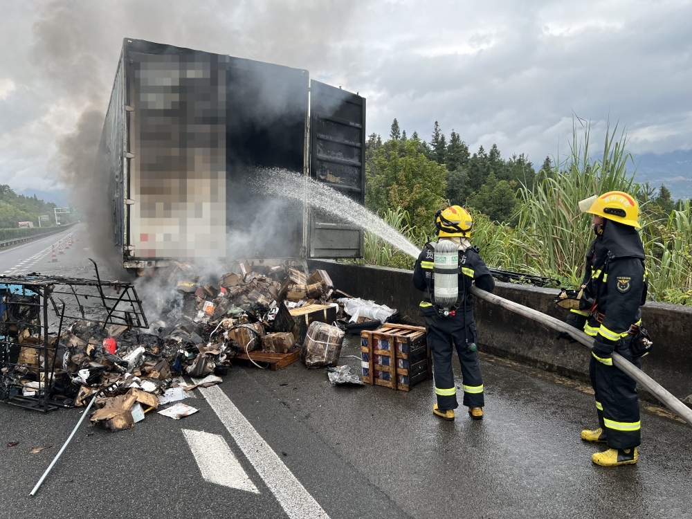 消防救援人员到达现场后,交警已对现场进行交通管制;经侦查发现,现场火势处于发展阶段,浓烟较大,轮胎已经烧穿漏气,集装箱及两侧正处于燃烧状态,车上堆积大量快递、杂货。