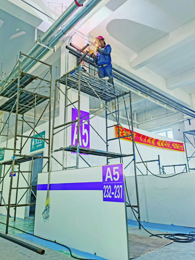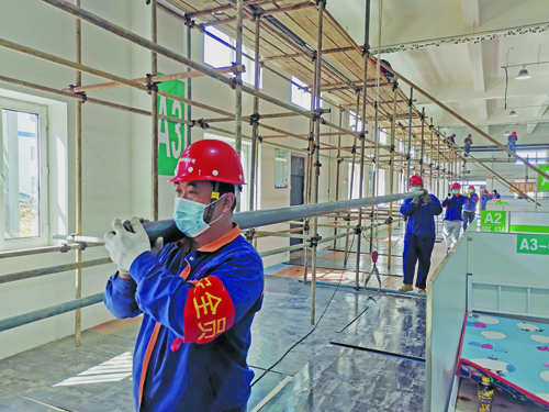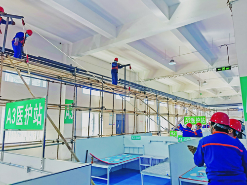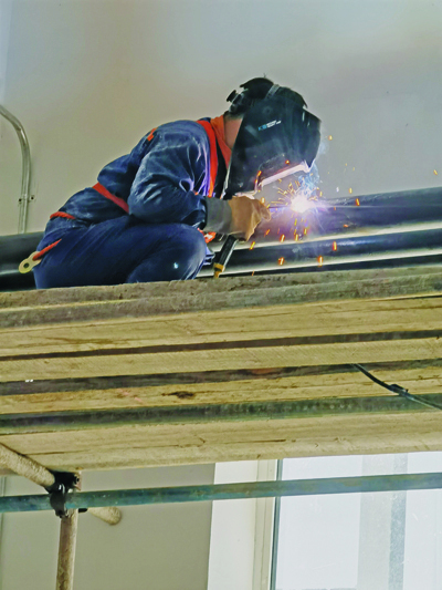 在施工现场,记者见到了市住建局公用事业服务中心杜军科长,他告诉记者:“市住建局贯彻市政府决策部署,组织动员中心城区供热企业捐资和出动人力建设方舱医院供热设施。9月6日入场,目前一网管线延长994米已经铺设完成,二网管线总长度220米,双线供回水也已完成。方舱医院共两栋楼,面积约1.7万平方米,采暖管线需安装2400米。现在工序正进入焊接楼内供热干管制作过程中。今天任务是楼板打孔、暖气供热立管连接,供热系统安置,供热回水管安装,明天下午暖气片运来,进行暖气安装。今天约180人在现场施工,明天集中加紧装暖气片,需要增加人手,预计施工人数得有250人。为了抢工期,施工人员起早贪黑,每天工作从早7点到晚6点,没有节假日,有的岗位延长一个多小时才能下班。为完成每日工作量进度,9月27日以内,所有工程满足注水、打压的条件,然后完成化热站工程,“十一”前实现彻底完工。”在方舱医院1号楼A3区南侧,六米高的脚手架上,几名施工人员共同托举着管线,完成焊接作业。市阳光热力集团万星供暖有限公司生产副总经理耿欣解释道,这次施工任务现场没有地沟,所有管线都是高空作业,尤其是管线焊接工作,虽然有脚手架保护,但是托架与托架之间距离较大,而且墙体是空心砖,中间位置托架是托不住的,施工中对管的时候,就得需要大量的人在上面,把管托起来,才能对接焊接。