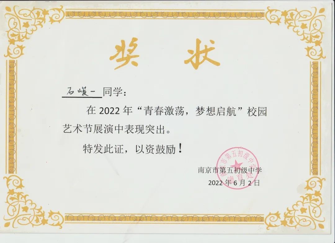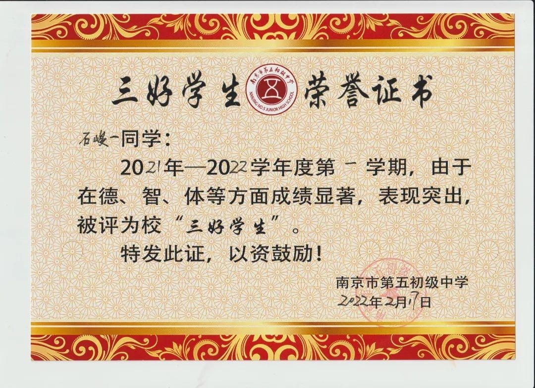 学校活动参与积极、有才、有想法。在初一一年的学习生活中,她积极参与了学校的升旗护卫队,六一节目演出,每次班级黑板报都有她的身影,多次申请学校志愿者,到社会上进行公益服务活动,在实践中锻炼自己。石峻一同学品学兼优,德智体美劳全面发展,做事尽善尽美,是一位优秀的初中生。