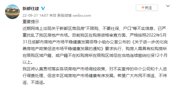 成都市新都区住房和城乡建设局官方微博发布重要提示: