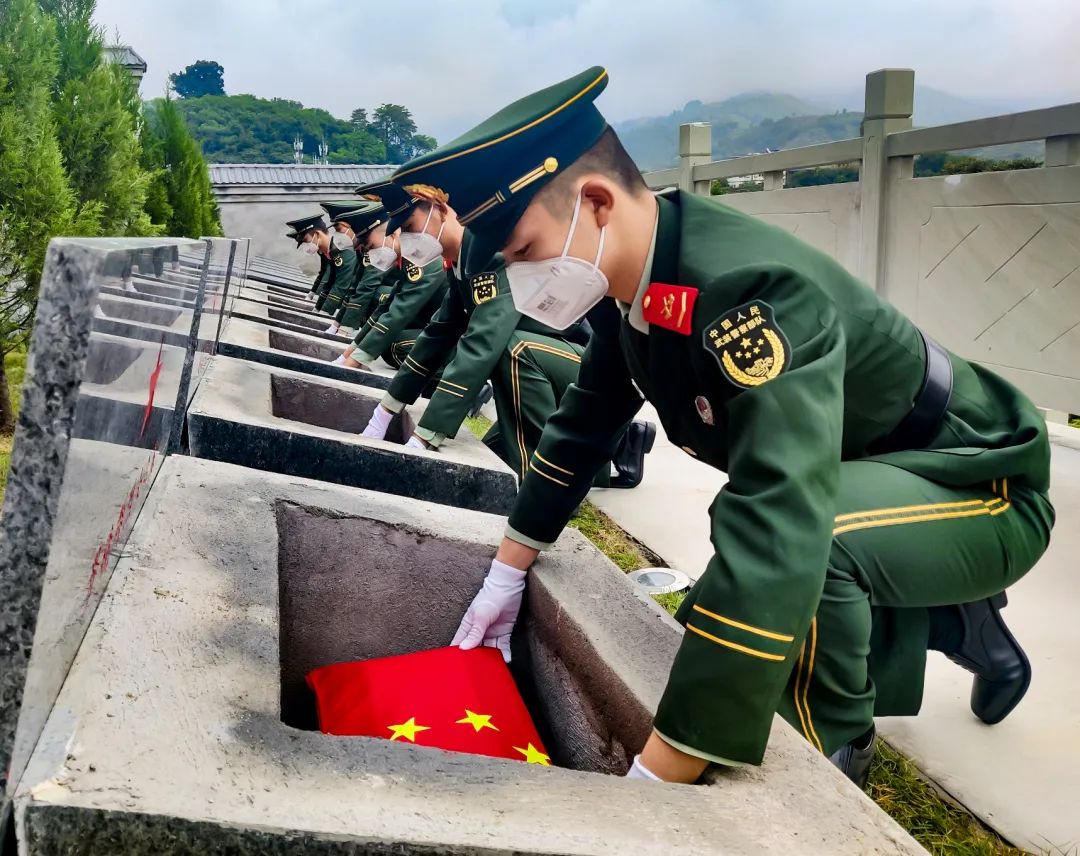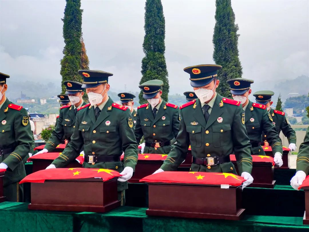 上午9时许,烈士安葬仪式正式开始,115名礼兵手捧烈士棺椁进入陵区。在雄壮的国歌声中,全体肃立向烈士默哀。随着《思念曲》低回奏响,烈士棺椁被礼兵缓缓护送至墓区,棺椁上覆盖的五星红旗如同熊熊燃烧的革命之火,吸引着全场人员的目光。