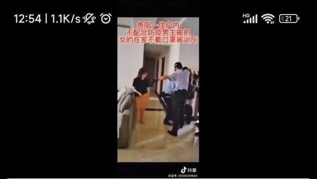 视频中,几名民警在居民家中对违法者进行搜身。作者还在视频中打出“贵阳一住户内不配合防疫,男主被抓,女的在家里不戴口罩被训斥”等醒目字样,引发网友的关注和转发。