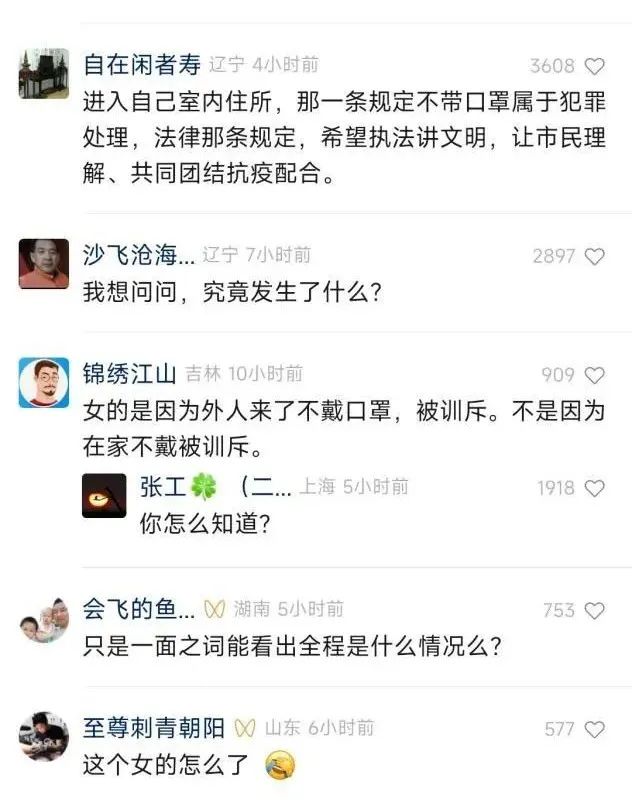 记者注意到,视频中,几名民警在一户居民家中,将一名男子按在墙上,并要求一名女子配合工作。一名民警说到:“疫情期间,不配合防疫措施,不尊重疫情防控工作人员,刚刚让开门的时候依然不配合,现在依法对你采取强制措施。”