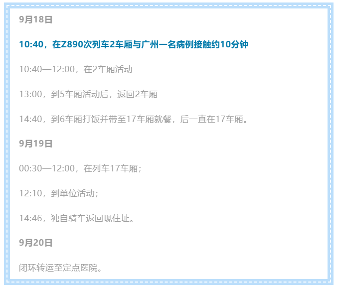 9月18日在广州火车站重点人群例行核酸筛查中发现1名列车保洁员核酸检测阳性;9月19日在济南下车乘客中发现1名阳性人员,9月20日在列车工作人员中发现2名阳性人员,涉及以下时间段相应区间站曾乘坐过K597、Z135、Z891和Z274/Z271的人员。