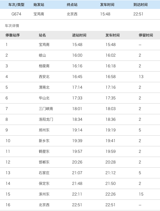 记者查询发现,G674次列车始发站是宝鸡南,终点站为北京西,途经西安、郑州东、鹤壁东、石家庄、保定东等站。