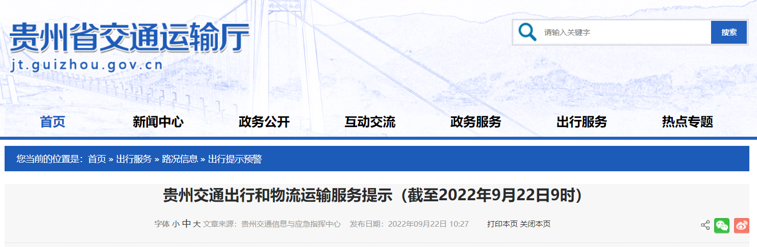 以上交通管制信息于每日上午10时、下午17时更新发布于“贵州省交通运输厅”门户网站首页“交通出行”栏目及“贵州12328”微信小程序。可拨打政务服务热线12345获取各地出行防疫政策,拨打交通运输服务监督热线电话12328获取最新交通动态。