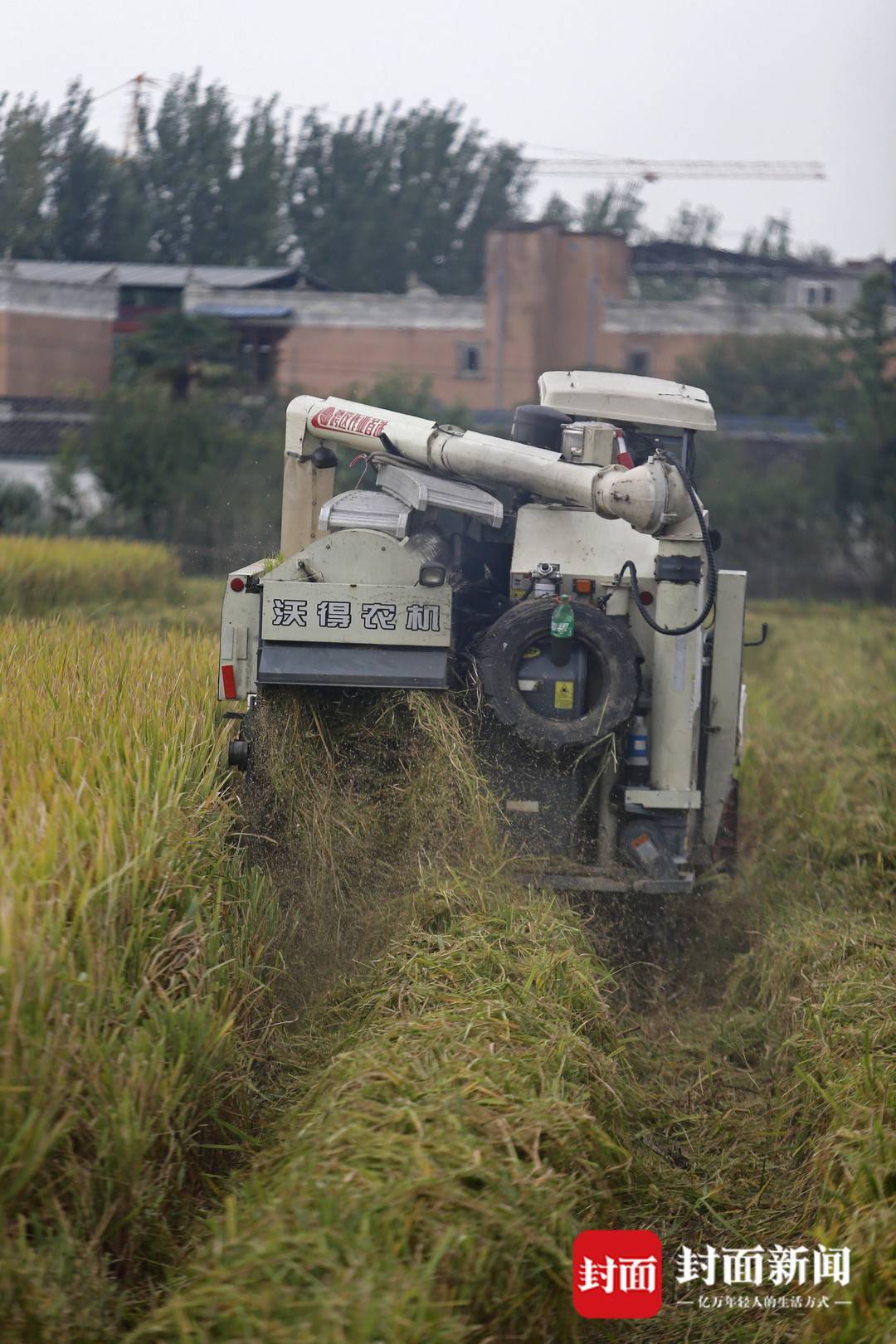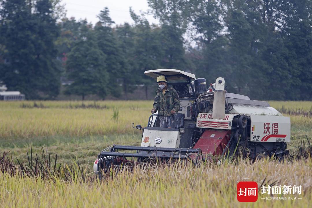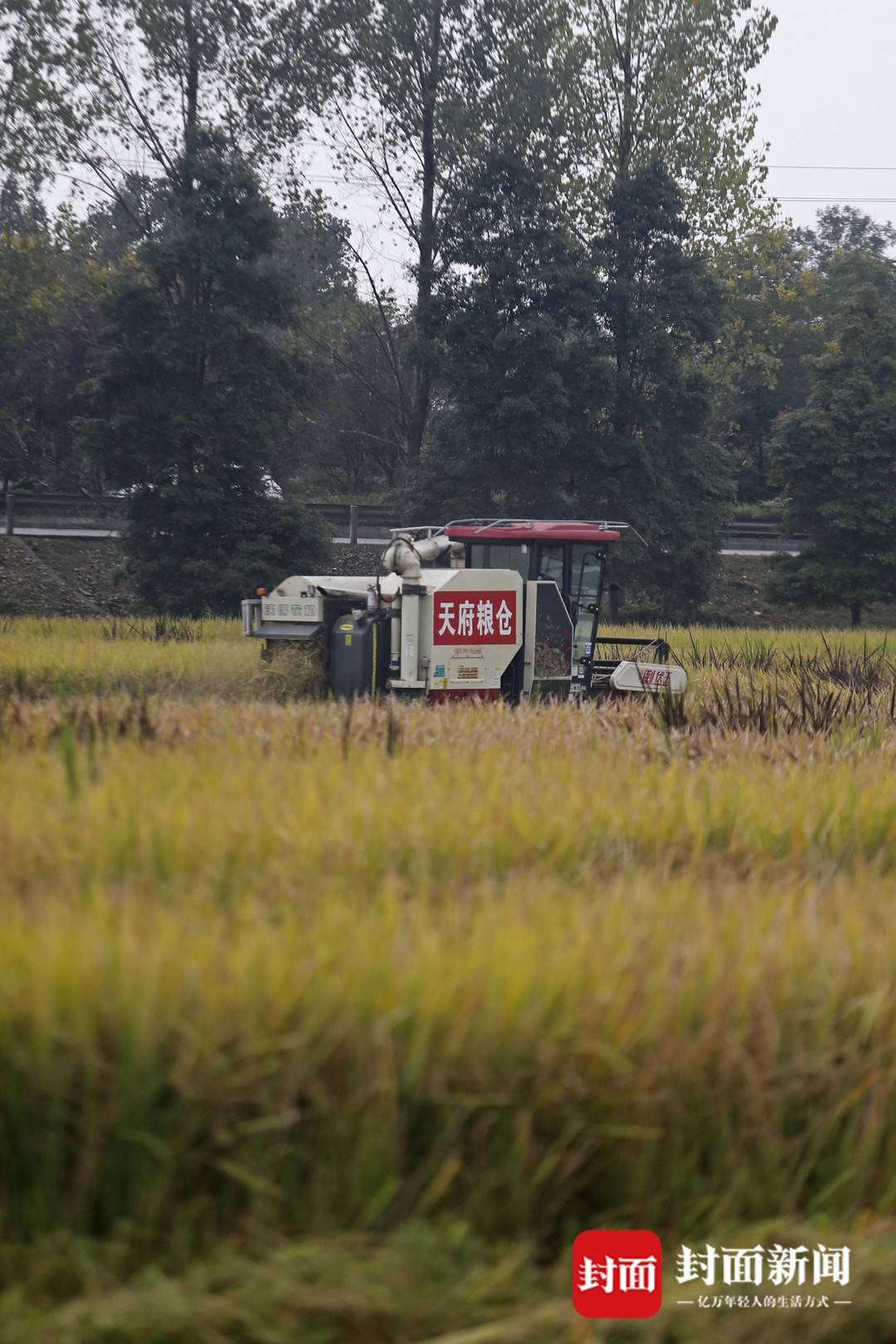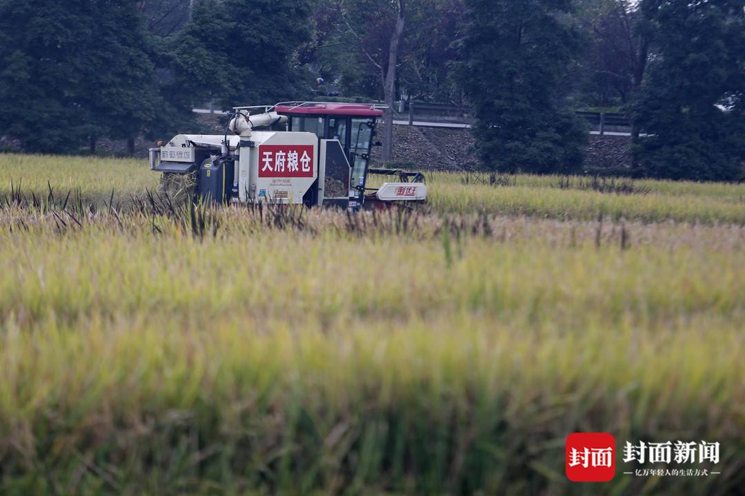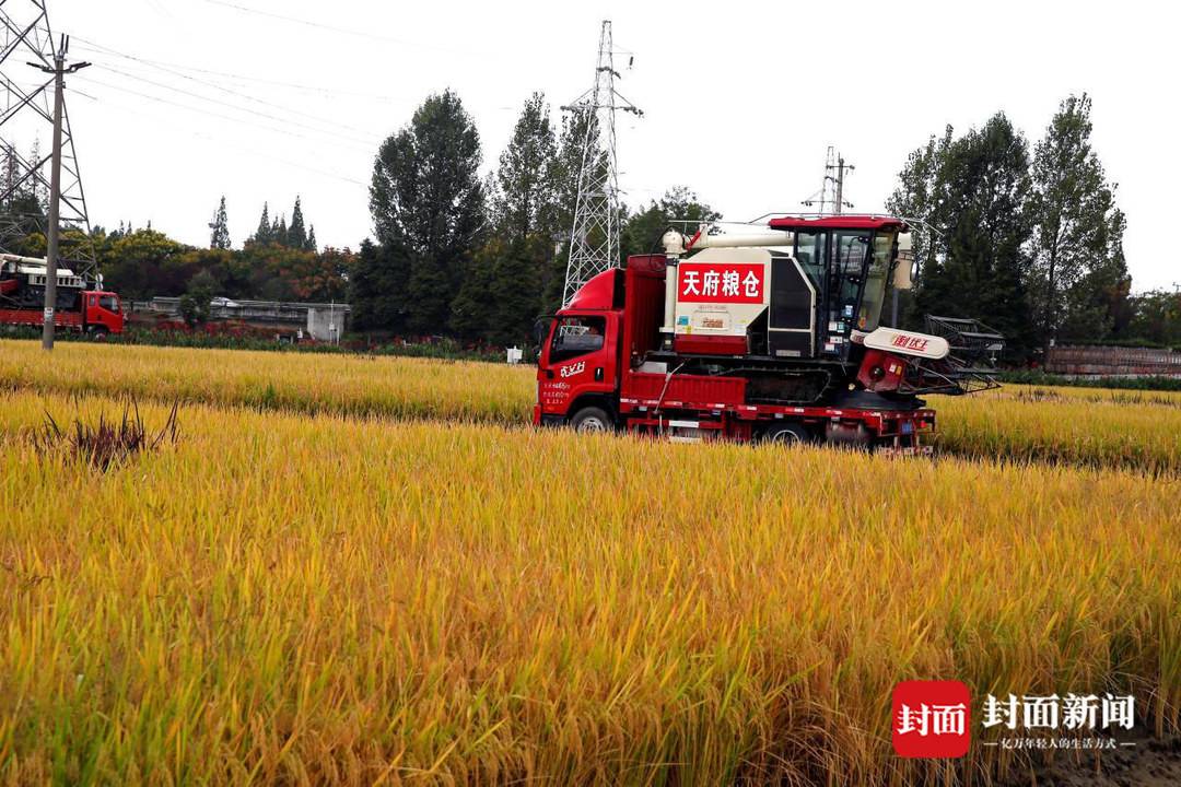 9月21日,在成都市天府粮仓国家现代农业产业园的高标准农田里,几辆收割机伴着轰隆隆的机器声,穿梭在金色的稻田,进行收割。