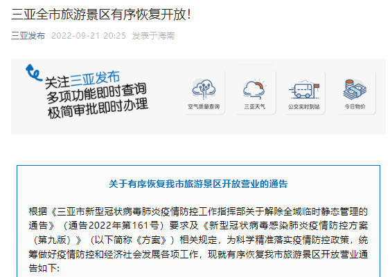 根据《三亚市新型冠状病毒肺炎疫情防控工作指挥部关于解除全域临时静态管理的通告》(通告2022年第161号)要求及《新型冠状病毒感染肺炎疫情防控方案(第九版)》(以下简称《方案》)相关规定,为科学精准落实疫情防控政策,统筹做好疫情防控和经济社会发展各项工作,现就有序恢复我市旅游景区开放营业通告如下: