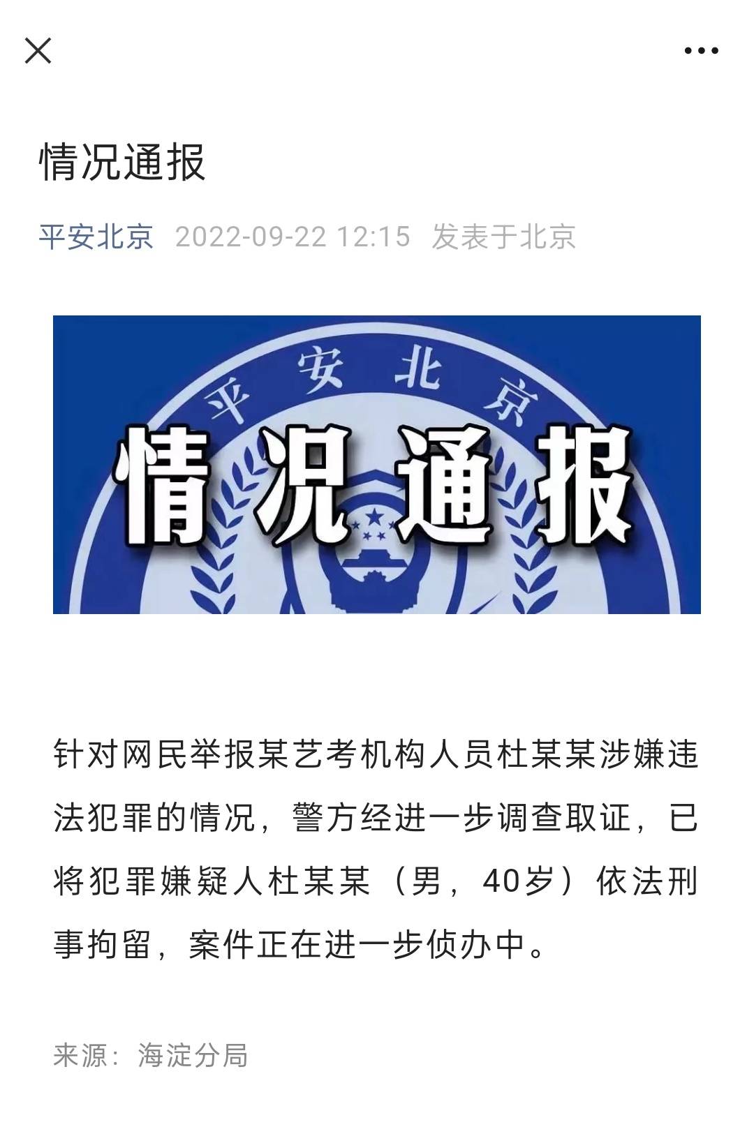 9月22日中午,北京市公安局海淀分局通报,针对网民举报某艺考机构人员杜某某涉嫌违法犯罪的情况,警方经进一步调查取证,已将犯罪嫌疑人杜某某(男,40岁)依法刑事拘留,案件正在进一步侦办中。
