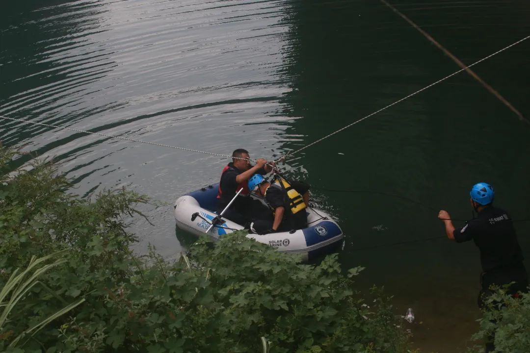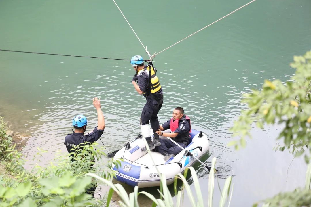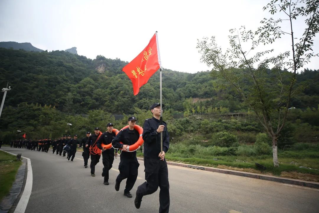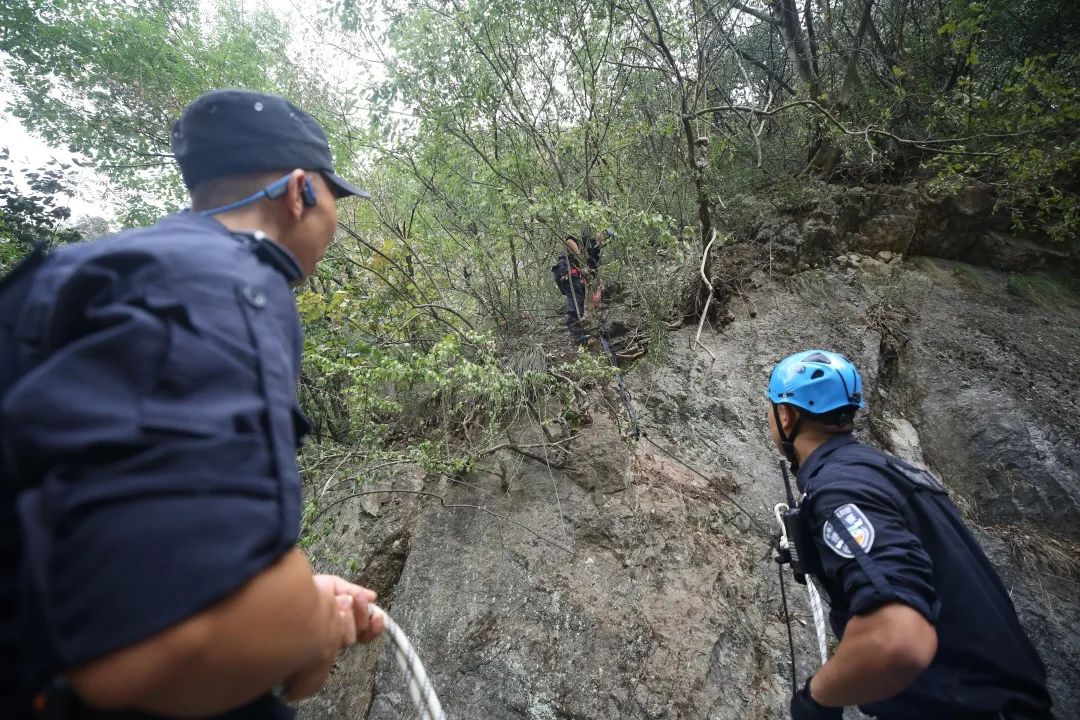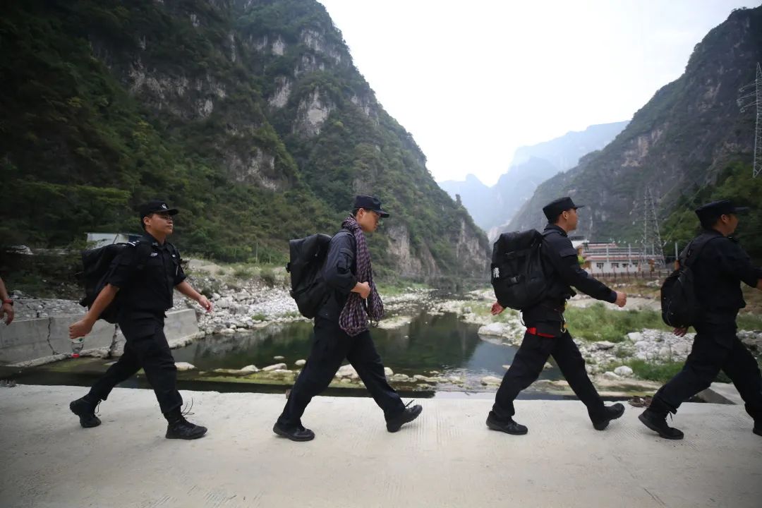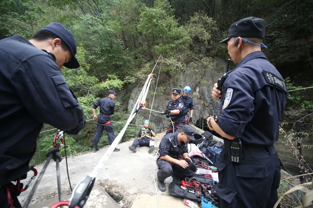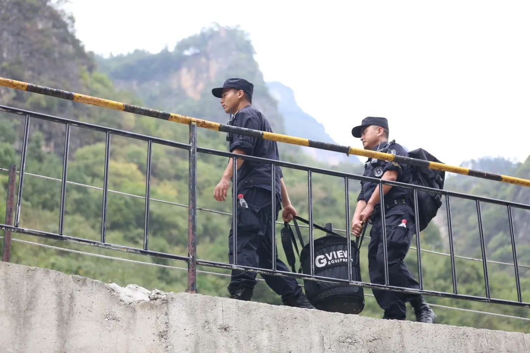 特巡警队员背上救援装备分成两组向预定救援点前进!