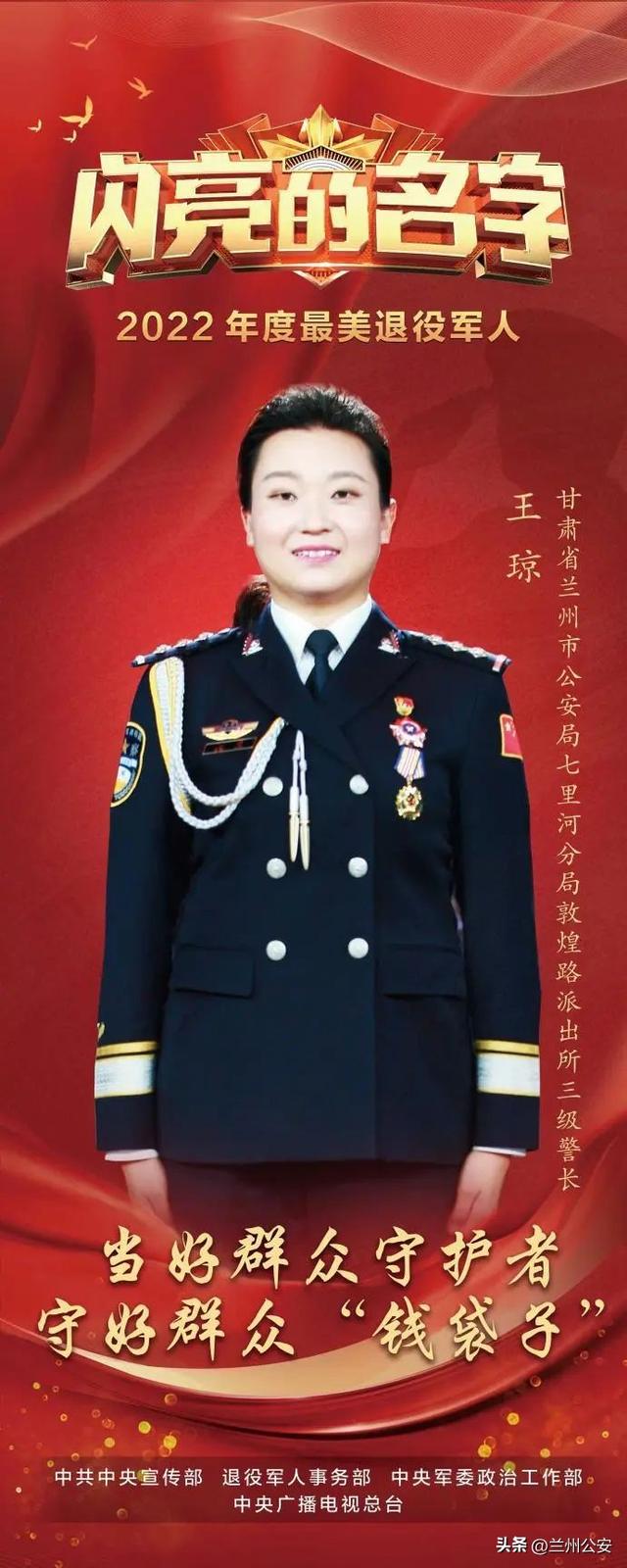 王琼,女,中共党员,1988年11月出生, 2006年12月入伍,服役于中国人民解放军新疆军区某部,2010年参加公安工作,现为兰州市公安局七里河分局敦煌路派出所社区民警,三级警长,被评为2022年度“最美退役军人”。