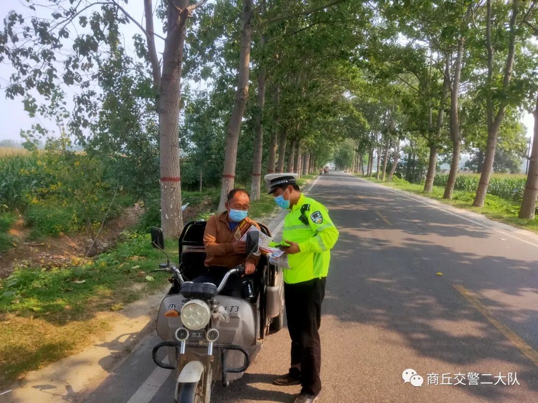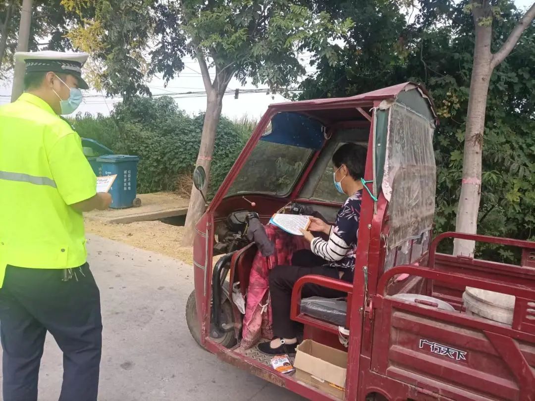 商丘交警向过往群众发放交通安全宣传单,现场讲解农村地区常见交通违法,重点讲解酒后驾驶、无证驾驶、超员、超速、摩托车不戴头盔、拖拉机载人等重点交通违法行为的危害及后果,提升广大群众对交通安全的重视度。