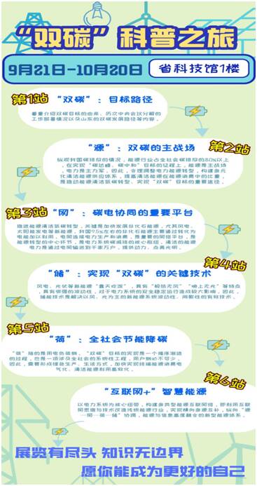 本次展览为期一个月(2022年9月21日-10月20日),以“双碳”概念的解读、碳减排和能源代替为主线,通过六个篇章的详细介绍,向大众展示电力行业为实现碳达峰,碳中和目标做出的贡献。同时,结合百姓日常生活,如安全用电、节约用电及新能源汽车替代燃油汽车等方面进行科普宣传,提升公众节约能源意识。