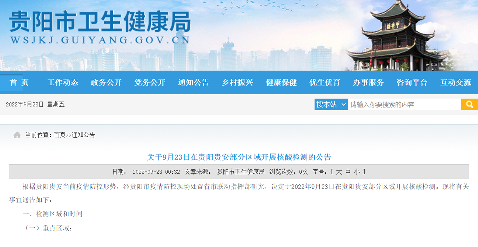根据贵阳贵安当前疫情防控形势,经贵阳市疫情防控现场处置省市联动指挥部研究,决定于2022年9月23日在贵阳贵安部分区域开展核酸检测。现将有关事宜通告如下: