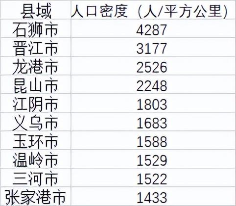 人口密度前十的县域分别是石狮、晋江、龙港、昆山、江阴、义乌、玉环、温岭、三河和张家港,主要来自闽南、苏南和浙中南以及毗邻北京的廊坊。