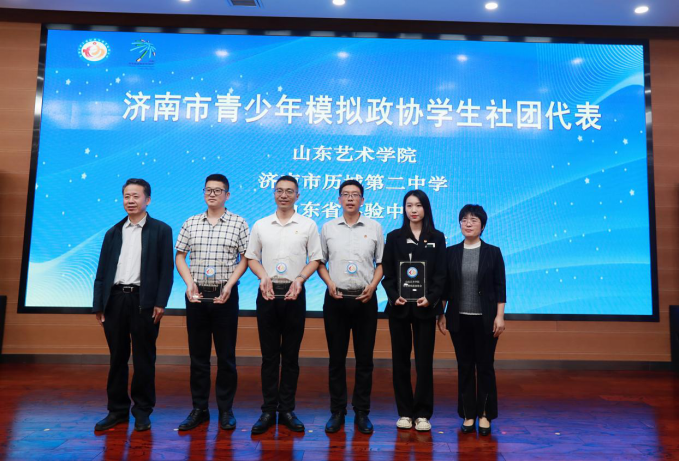 市政协提案委主任乔谦、团市委副书记孟云霞为模拟政协学生社团优秀代表山东艺术学院、济南市历城第二中学、山东省实验中学、济南市莱芜第一中学等四家单位授牌。