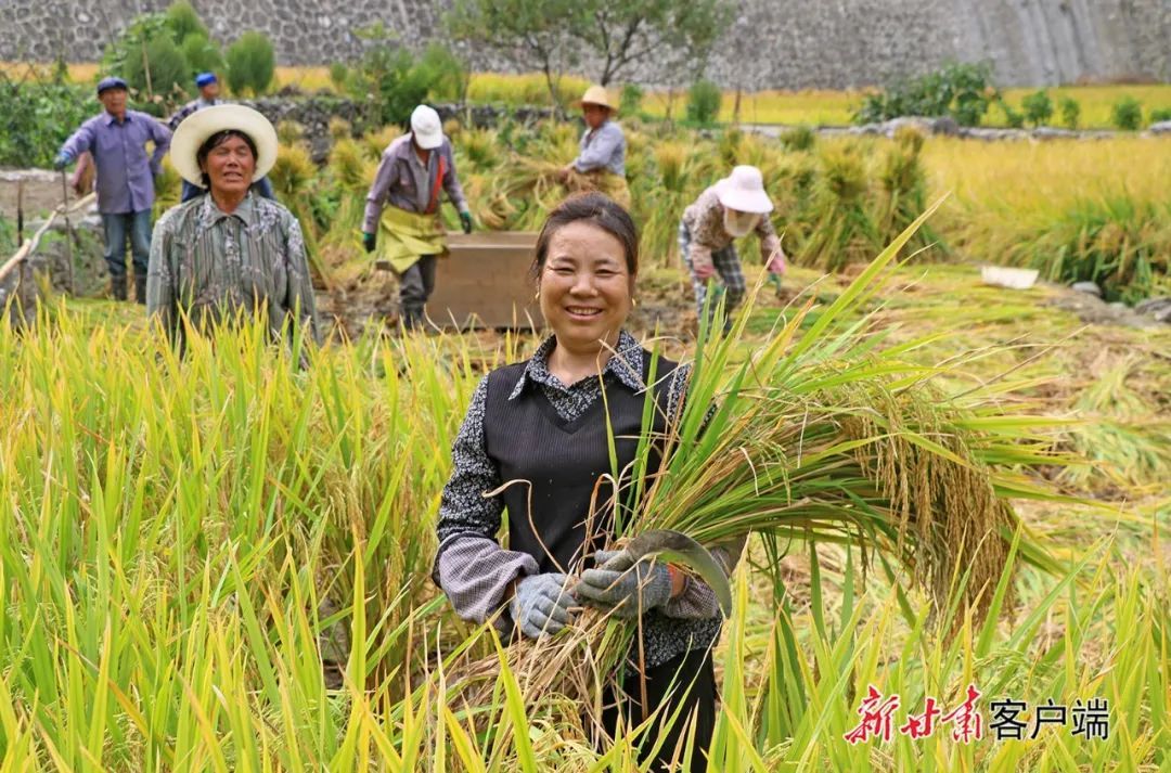 文县城关镇马家坝群众正在收割水稻。新甘肃·甘肃日报通讯员 王小勇 这就是最熟悉的丰收“序曲”奏响在一滴滴晶莹汗水里悠扬在一张张收获笑脸上