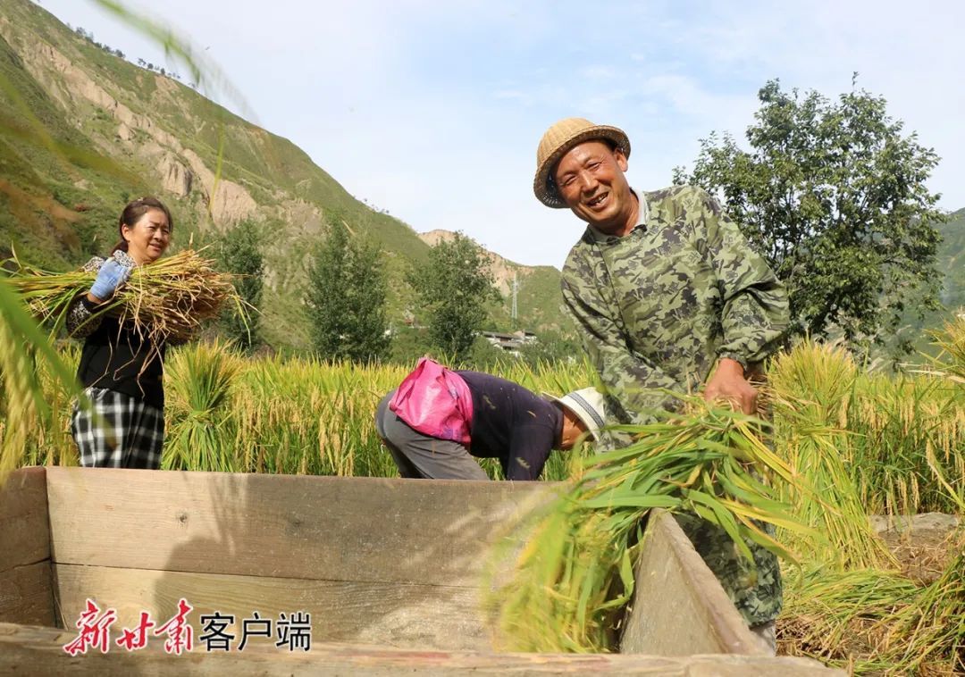 村民正在康县大南峪镇郑湾村的稻田里收割稻谷。新甘肃·甘肃日报通讯员 黄培军