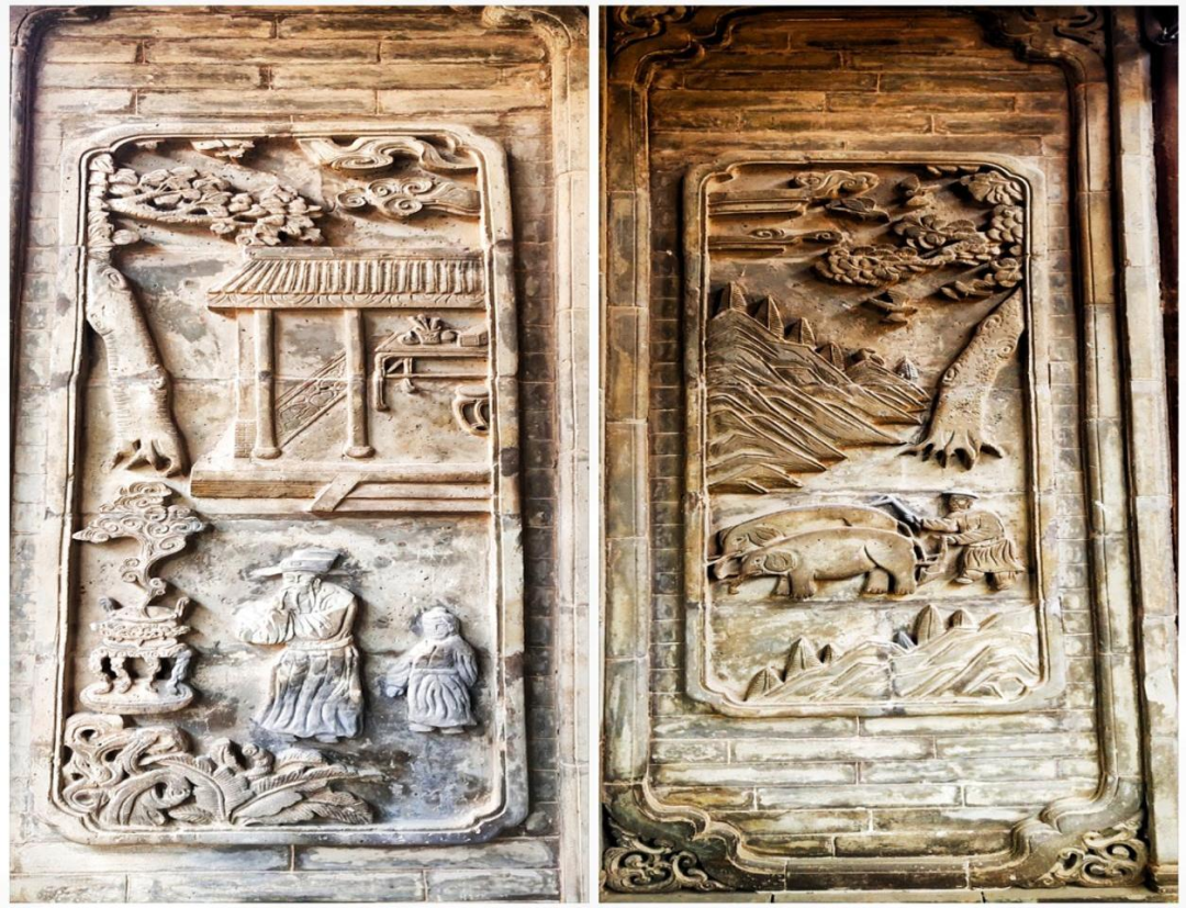 东面砖雕是“黔娄告天”,即“尝粪忧心”的故事。庾黔娄当时任孱陵县的知县,上任不久,某天突然感到心烦意乱,便辞官回家,回到家中发现老父亲病得非常严重,郎中说父亲已经没有脉象,要知父亲病的轻重,只有尝一下父亲的大便,苦味尚有一线生机,甜味则无力回天。庾黔娄亲自尝父亲大便,结果味道是甜的,他非常伤心,当晚带书童到院中设案焚香祈祷,乞求上天自愿减少自己的寿命来换取父亲的生命。他的这份诚纯的孝心感动了上天,经过郎中的精心治疗和他的悉心照顾,父亲病情好转。这两幅砖雕教育高氏子孙要传承孝顺,尊老爱幼,秉承祖先耕读传家的优良传统,耕可养家,读可立身。