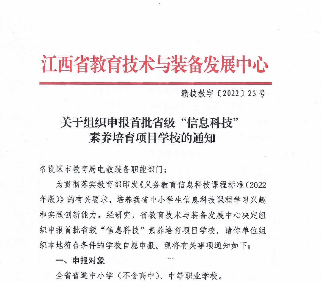 2022年5月,教育部印发《义务教育信息科技课程标准(2022年版)》,简称信息科技新课标。江西省教育技术与装备发展中心为贯彻落实教育部印发《义务教育信息科技课程标准(2022年版)》的有关要求,培养江西省中小学生信息科技课程学习兴趣和实践创新能力。经研究,江西省教育技术与装备发展中心决定组织申报首批省级“信息科技”素养培育项目学校。