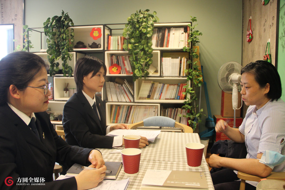 北京市海淀区法院进行法庭翻译的调研,石晓倩(中)与李荣(右一)就手语翻译工作进行沟通