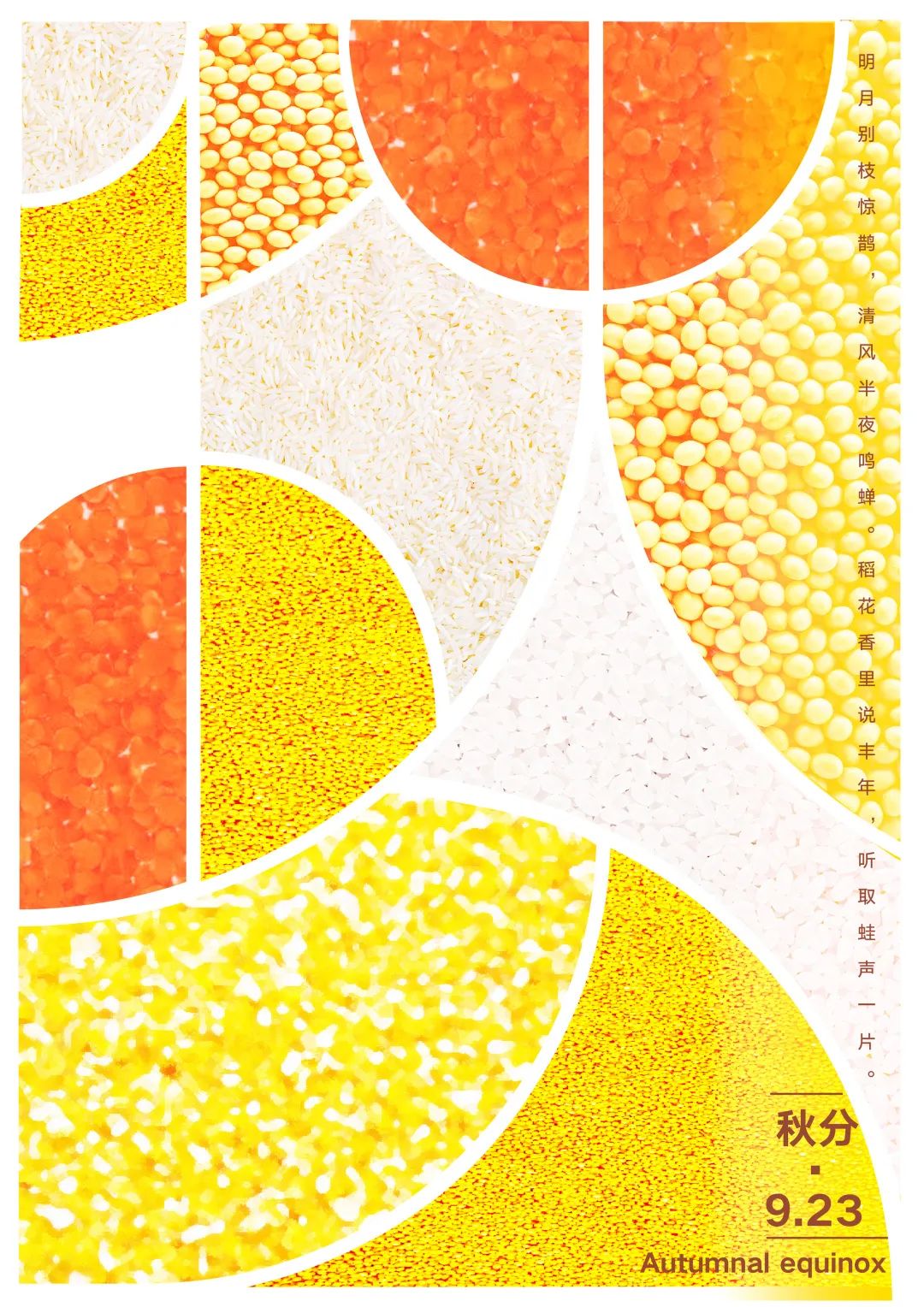 秋分来袭,庄稼熟了,田野里一片金黄,洋溢着收割的喜悦。选用五谷作为秋分节气的名片,将稻、黍、稷、麦、菽分别用不同的方式呈现,结合本真的色彩进行设计,整张海报洋溢着秋日的温暖,散落一片金色的光芒。