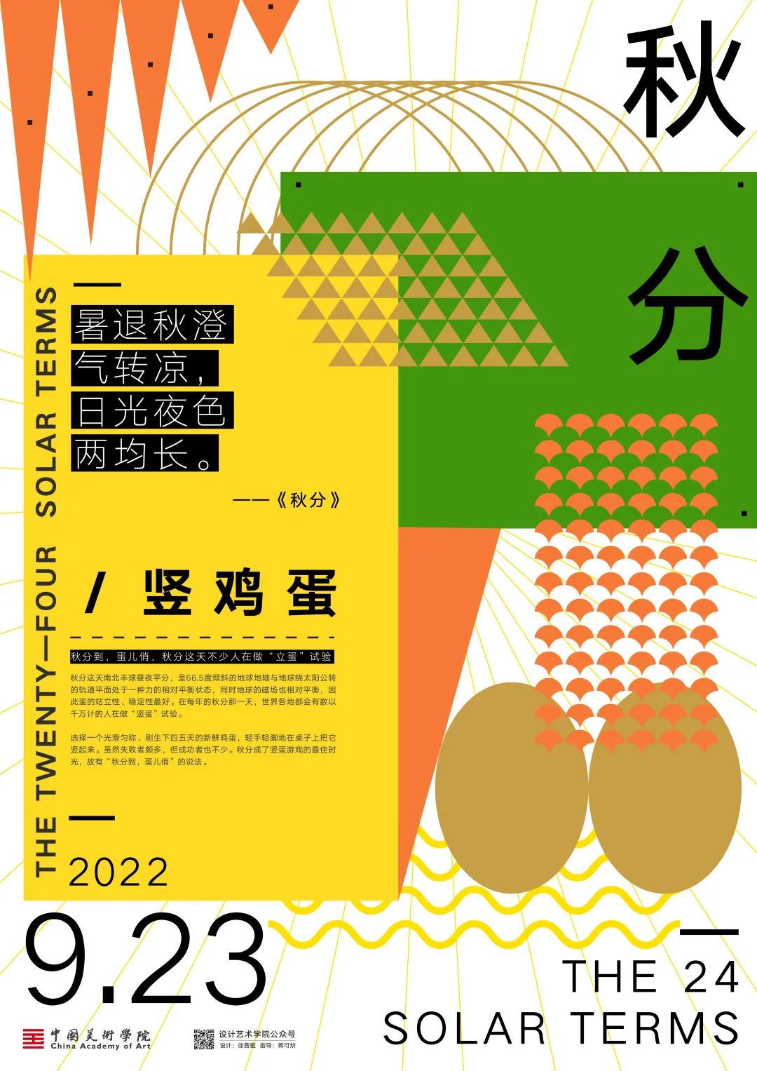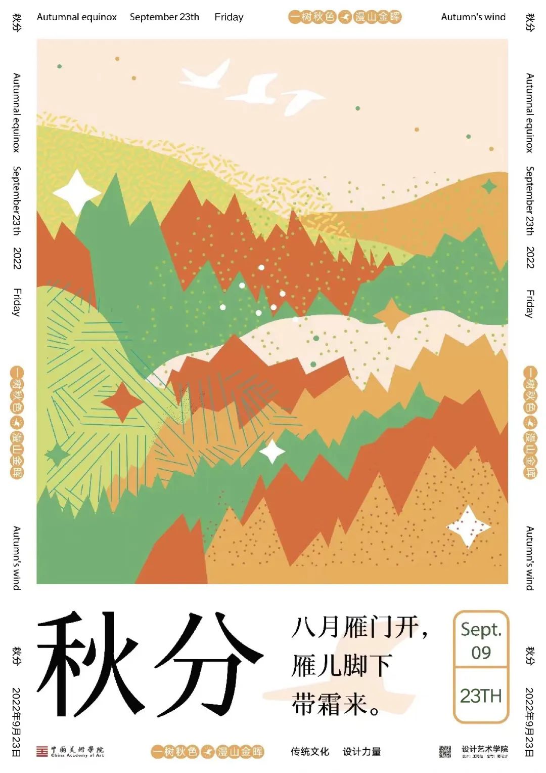 秋分,是二十四节气之第十六个节气,秋季第四个节气。斗指酉;太阳达黄经180°;于每年的公历9月22-24日交节。秋分这天太阳几乎直射地球赤道,全球各地昼夜等长。秋分,“分”即为“平分”、“半”的意思,除了指昼夜平分外,还有一层意思是平分了秋季。秋分日后,太阳光直射位置南移,北半球昼短夜长,昼夜温差加大,气温逐日下降。秋分曾是传统的“祭月节”,中秋节由“秋夕祭月”演变而来。当古老的传统文化与极富创造性思维的设计相融合,会碰撞出怎样的火花呢?值此秋天来临之际,设计艺术学院的师生共同创作了秋分系列海报,为秋日增添了艺术气息。