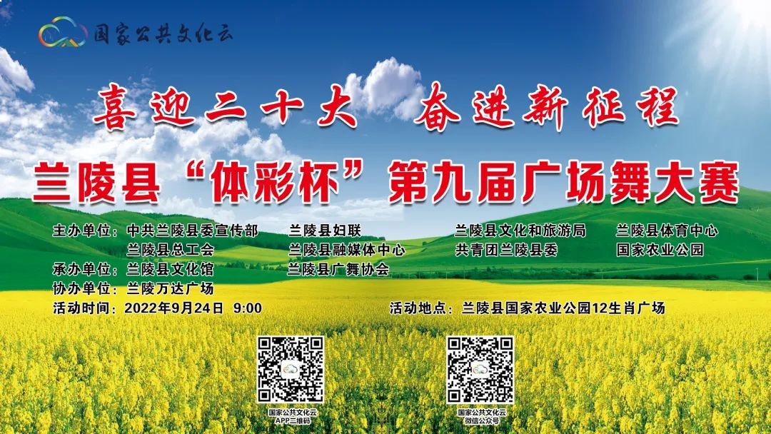 “喜迎二十大 奋进新征程” 2022年兰陵县“体彩杯”第九届广场舞大赛将于2022年9月24日 9:00(直播时间9:10)在国家公共文化云上演,赶紧扫描二维码观看吧!