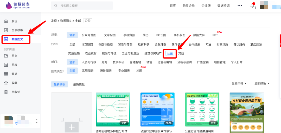 电脑PC端登录镝数图表dycharts.com,点击【数据图文】,在行业选项中选择【公益】,就可以找到这些新模板啦!