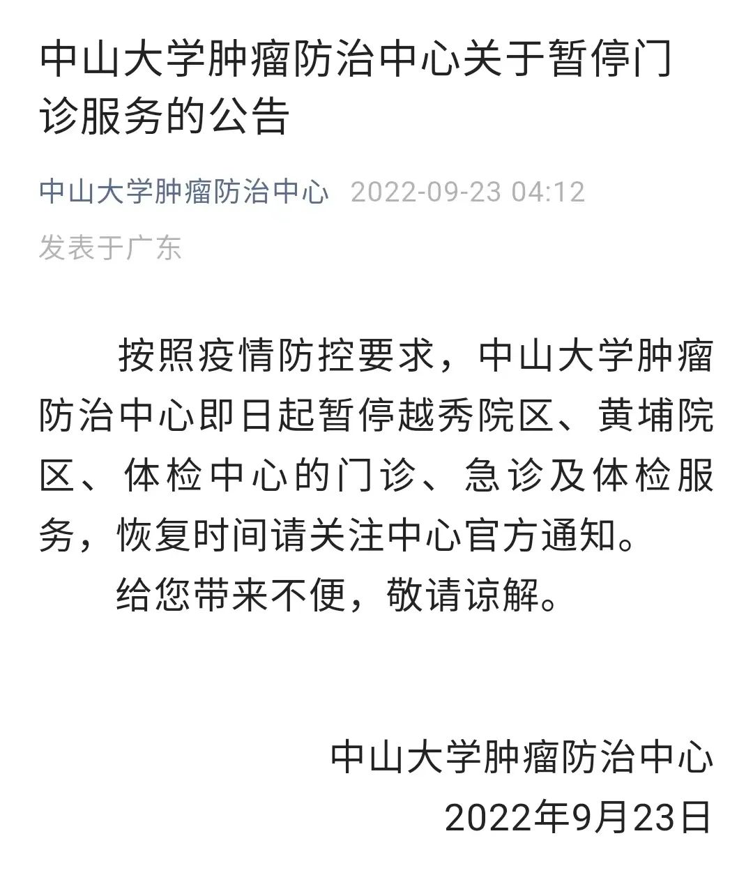 中山大学肿瘤防治中心暂停门诊9月23日,中山大学肿瘤防治中心发布公告,按照疫情防控要求,中山大学肿瘤防治中心即日起暂停越秀院区、黄埔院区、体检中心的门诊、急诊及体检服务,恢复时间请关注中心官方通知。