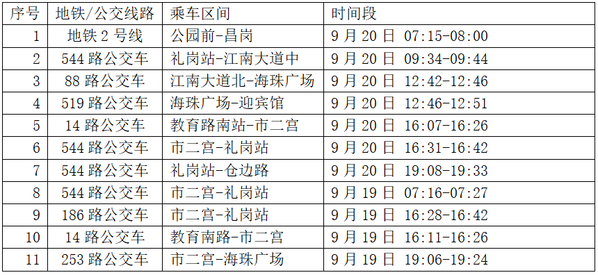 据广州疾控22日下午发出重要提醒:因疫情防控需要,在9月19日~9月20日以下时间段相应区间站曾乘坐广州地铁2号线以及相应公交车次的市民朋友,请主动向社区报备并就近进行核酸检测,做好3天2检及自我健康监测,如出现不适请及时就医。