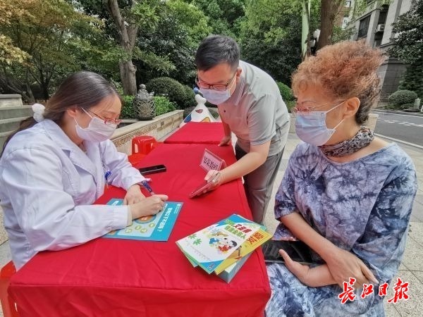 江汉疾控工作人员走进楼栋为居民科普健康知识。记者余丹夏 摄