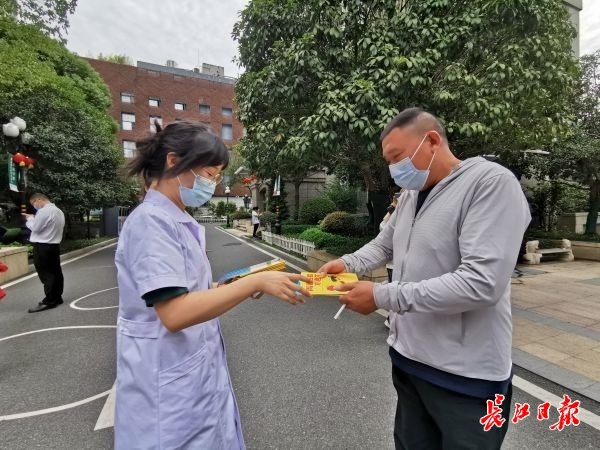 江汉疾控工作人员为居民发放宣传资料。记者余丹夏 摄